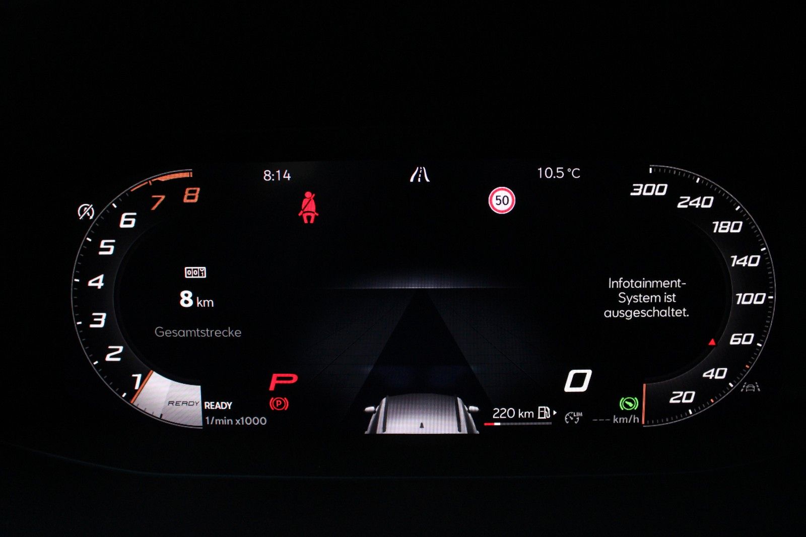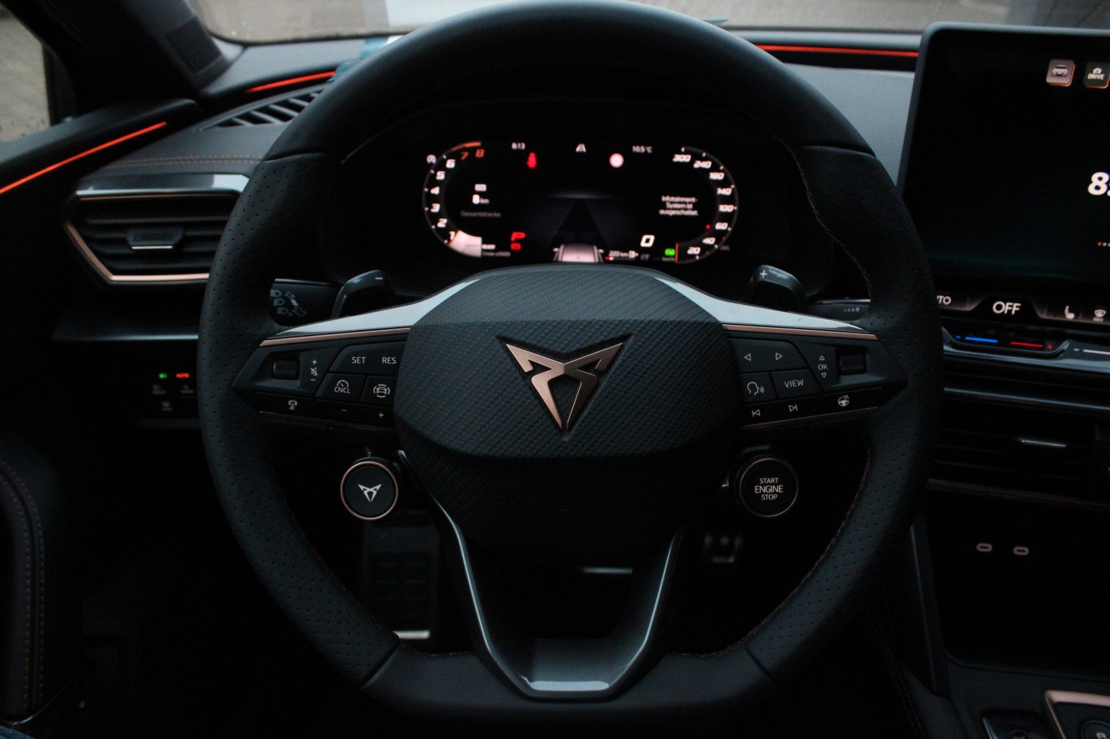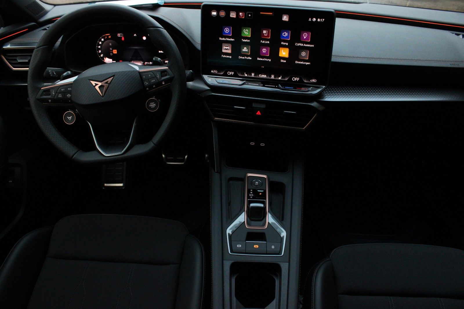6 Lautsprecher, Abdeckkappen Außenspiegel Dark Aluminium, Airbag Beifahrerseite abschaltbar, Airbag Fahrer-/Beifahrerseite, Außenspiegel elektr. verstell-, heiz- und anklappbar mit Spiegelabsenkung und Welcome Light, Connectivity-Box, Dachhimmel schwarz, Dachreling schwarz, hochglänzend, Differentialsperre (Vorderachse), Einparkhilfe vorn und hinten, Einstiegsleisten vorn beleuchtet, Elektron. Differentialsperre (XDS), Fahrassistenz-System: Fahrprofilauswahl (CUPRA Drive Profile), Fensterheber elektrisch vorn + hinten mit Komfortschaltung, Fensterzierleisten schwarz hochglänzend, Full Link (MirrorLink, Apple CarPlay und Android Auto), Gepäck-/Laderaumboden doppelt, Gepäckraum-Abtrennung (Netz), Gepäckraumabdeckung / Rollo, Gepäckraumbeleuchtung (LED), Handschuhfach mit LED-Beleuchtung, Innenausstattung: Interieurleisten Copper, Isofix-Aufnahmen für Kindersitz an Beifahrersitz und Rücksitz (inkl. i-Size-Kindersitze), Karosserie: 5-türig, Klimaanlage Climatronic 3-Zonen, Kombiinstrument digital (virtual cockpit), Kopf-Airbag-System, Kopfstützen hinten (3-fach), Lendenwirbelstütze Sitz vorn links, verstellbar, Lendenwirbelstütze Sitz vorn rechts, verstellbar, Leseleuchten hinten LED, Leseleuchten vorn LED, Licht- und Sicht-Paket, LM-Felgen, Media-System Plus, Mild-Hybrid 110 kW (Motor 1,5 Ltr. - 110 kW eTSI), Mobile Online Dienste Cupra Connect, Modellpflege, Notrufsystem, Parkbremse elektrisch mit Auto-Hold-Funktion, Radioempfang digital (DAB+), Reifen-Reparaturset, Rücksitzlehne geteilt/klappbar mit Mittelarmlehne und Durchladeeinrichtung, Rücksitzlehnen umklappbar mit Fernentriegelung im Kofferraum, Schadstoffarm nach Abgasnorm Euro 6e, Seitenairbag, Seitenairbag vorn mitte (Central Airbag), Seitenscheiben ab 2.Sitzreihe und Heckscheibe dunkel getönt (Privacy Glass), Sicherheitsgurte vorn höhenverstellbar, Sitz vorn links höhenverstellbar, Sitz vorn rechts höhenverstellbar, Sitzbezug / Polsterung: Stoff/Kunstleder schwarz (Sharp Textil), Sonderlackierung Fiord-Blau, Sonnenblende links mit Spiegel (beleuchtet), Sonnenblende rechts mit Spiegel (beleuchtet), Sportsitze vorn, Steckdose 230V im Gepäckraum, USB-Ladeanschlüsse (2-fach, Typ C) für 2.Sitzreihe, USB-Schnittstelle vorn (2-fach, Typ C), Verzurrösen Koffer-/Laderaum, Voll-LED-Paket, Warnanlage für Sicherheitsgurt-System, Wärmeschutzverglasung