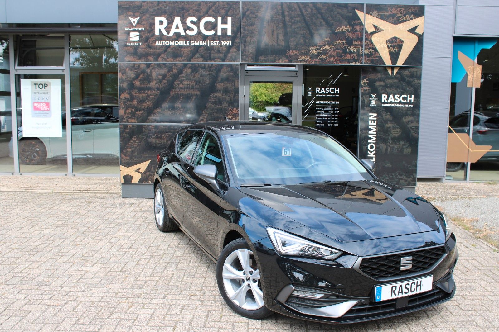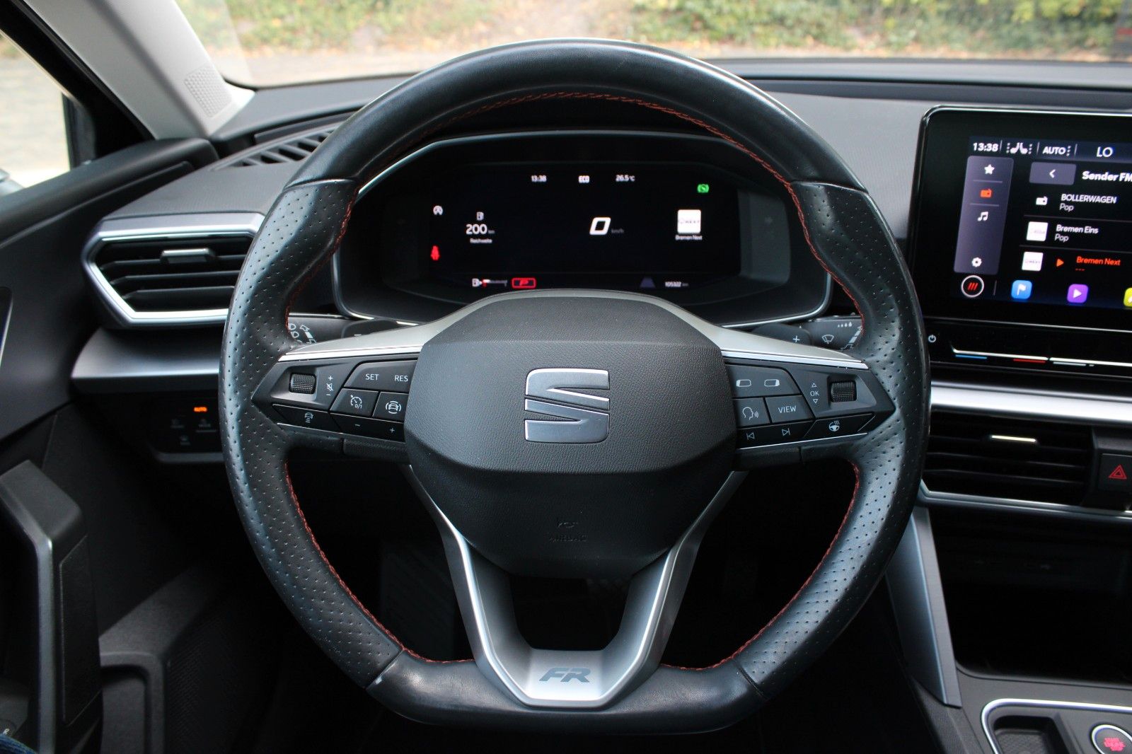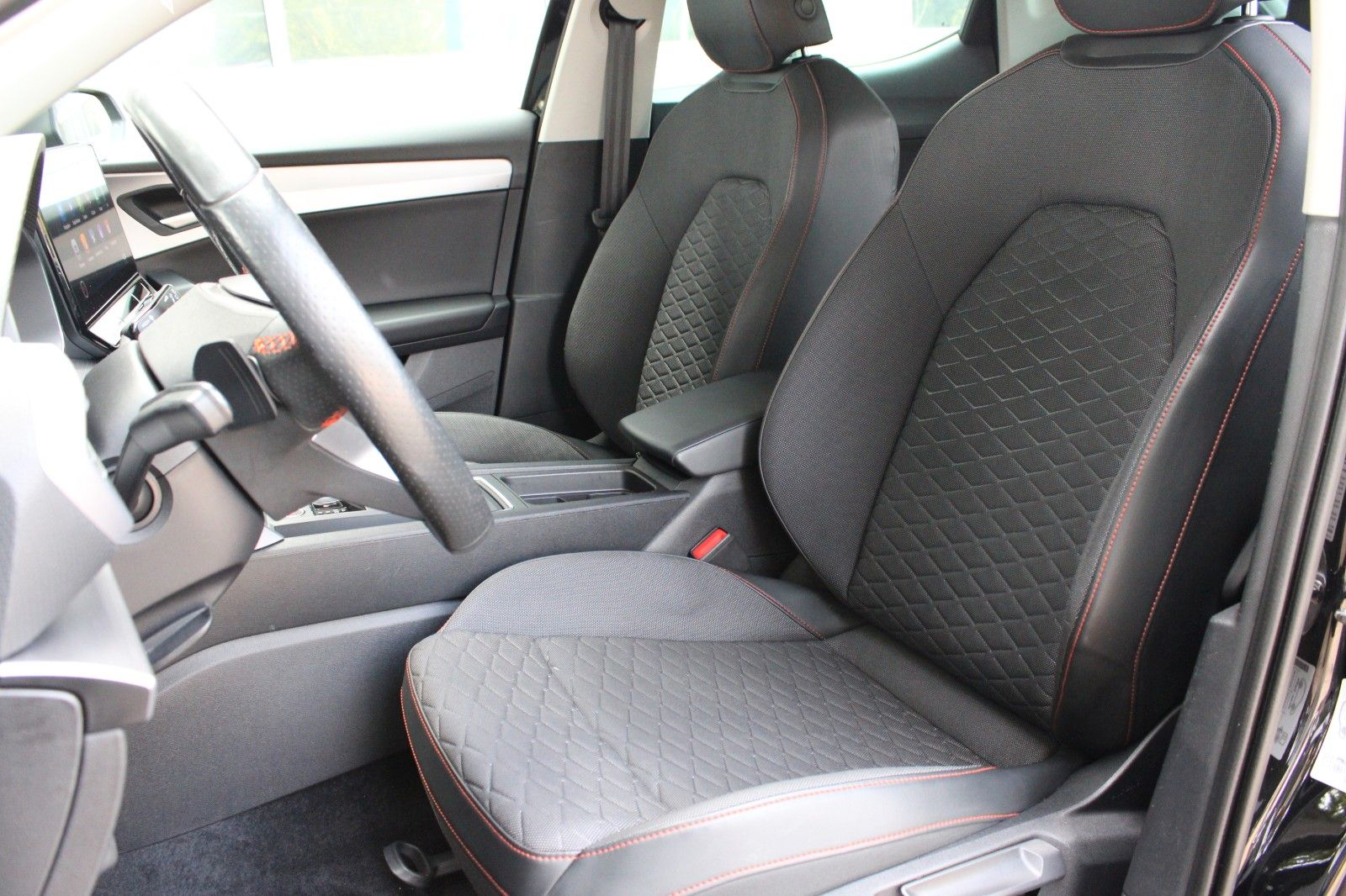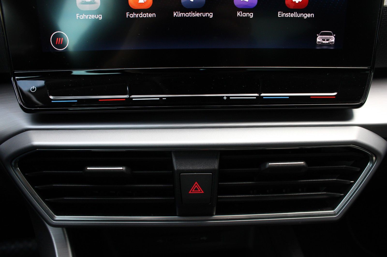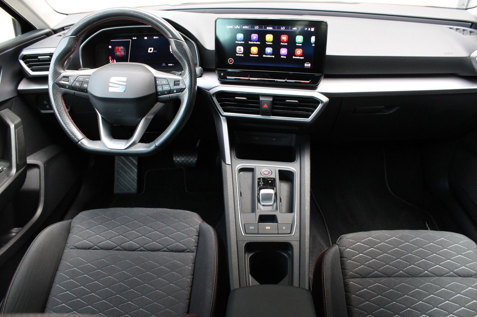 6 Lautsprecher, Ablagetasche an Vordersitzlehnen, Airbag Beifahrerseite abschaltbar, Airbag Fahrer-/Beifahrerseite, Antriebs-Schlupfregelung (ASR), Außenspiegel elektr. verstell-, heiz- und anklappbar mit Spiegelabsenkung, Außenspiegel grau, Blinkleuchten LED in Außenspiegel integriert, Bluetooth-Schnittstelle mit Freisprecheinrichtung integriert, Bordcomputer, Doppeltonhorn, Einstiegsleisten beleuchtet, Elektron. Querdifferentialsperre (XDS), Fahrassistenz-System: Fahrprofilauswahl (SEAT Drive Profile), Fahrassistenz-System: Müdigkeitserkennung, Fahrassistenz-System: Spurhalteassistent, Fahrassistenz-System: Umfeldbeobachtungssystem (Front assist) mit City-Notbremsfunktion, Fensterheber elektrisch vorn + hinten mit Komfortschaltung, Gepäckraumabdeckung / Rollo, Handschuhfach beleuchtet, Heckleuchten Voll-LED mit dynamischem Lichtband (Infinite Light), Innenraumlicht-Paket LED, Isofix-Aufnahmen für Kindersitz, Karosserie: 5-türig, Klimaanlage Climatronic 3-Zonen, Kofferraumbeleuchtung, Kombiinstrument digital (virtual cockpit), Kopf-Airbag-System, Lendenwirbelstütze Sitz vorn links, verstellbar, Lendenwirbelstütze Sitz vorn rechts, verstellbar, Lenkrad (Sport/Leder) mit Multifunktion, LM-Felgen, Mild-Hybrid 110 kW (Motor 1,5 Ltr. - 110 kW eTSI ACT), Mobile Online Dienste Seat Connect, Nebelscheinwerfer LED mit Abbiegelicht, Notrufsystem, Otto-Partikelfilter (OPF), Parkbremse elektrisch mit Auto-Hold-Funktion, Radioempfang digital (DAB+), Reifen-Reparaturset, Reifenkontroll-Anzeige, Rücksitzlehne geteilt/klappbar (1/3-2/3), Schadstoffarm nach Abgasnorm Euro 6d-TEMP, Schalt-/Wählhebelgriff Leder, Seitenairbag, Seitenscheiben hinten und Heckscheibe abgedunkelt, Sitz vorn links höhenverstellbar, Sitz vorn rechts höhenverstellbar, Sitzbezug / Polsterung: Stoff, Sport-Fahrwerk, Sport-Komfortsitze vorn, Start/Stop-Anlage, Steckdose (12V-Anschluß) vorn, Stoßfänger FR-Design, USB-Schnittstelle vorn (2-fach, Typ C), Verzurrösen Koffer-/Laderaum, Warnanlage für Sicherheitsgurt-System, Wärmeschutzverglasung